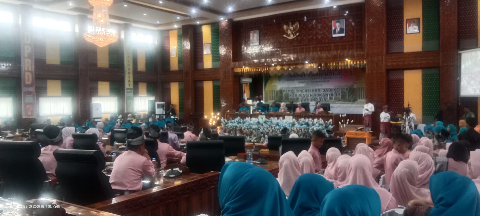 ROKAN HILIR- Dewan Perwakilan Rakyat Daerah (DPRD) Kabupaten Rokan Hilir (Rohil) menggelar rapat paripurna dengan agenda memperingati hari jadi ke-26 Kabupaten Rokan Hilir, di kantor DPRD, batu 6 Bagansiapiapi, Sabtu (4/10/2025) pagi.