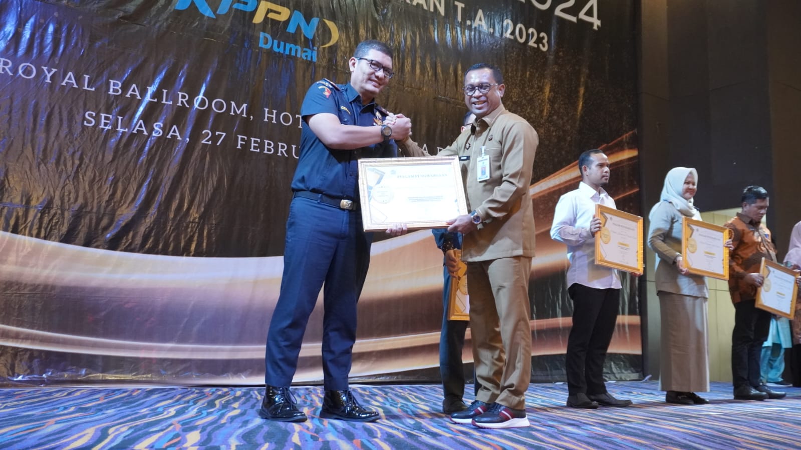 DUMAI- Bupati Kabupaten Rokan Hilir Afrizal Sintong diwakili Sekretaris Daerah (Sekda) H. Fauzi Efrizal S. Sos, M. Si menghadiri acara Gelanggang Awards 2024 Gemilang pengelolaan anggaran tahun 2023. Kegiatan tersebut di pusatkan di Ballroom Hotel Comforta Dumai, Selasa (27/2/2024).