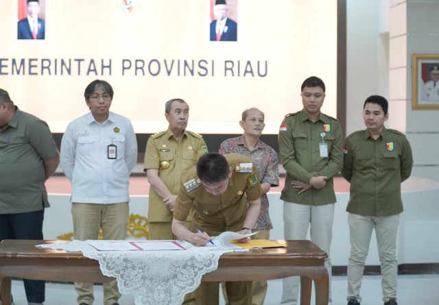 PEKANBARU-Bupati Kabupaten Rokan Hilir Afrizal Sintong, S.IP, Bupati Rohil mengikuti Rapat Koordinasi dan Penandatanganan Percepatan Pengelolaan Partisipasi Interes (PI) 10% wilayah kerja Rokan di Balai Pauh Janggi gedung daerah Gubernuran kota Pekanbaru. Selasa, 20/6/23 .