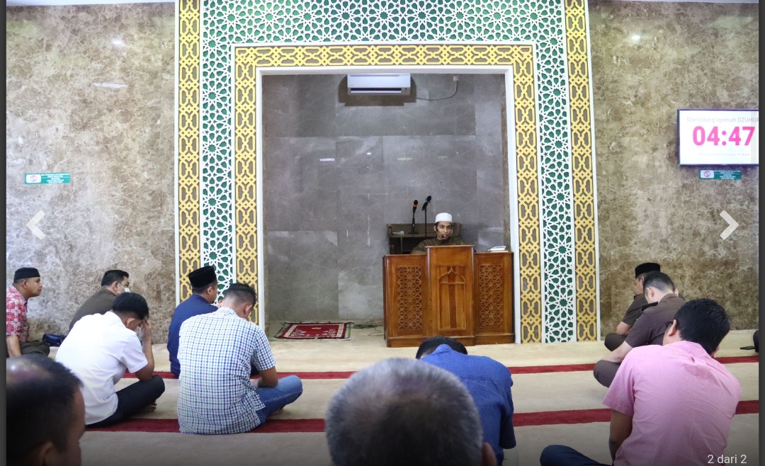 Kegiatan Tausiyah Qobla Dzuhur di Masjid Al-Mizan Kejaksaan Tinggi Riau mengikuti secara ketat protokol kesehatan (prokes)